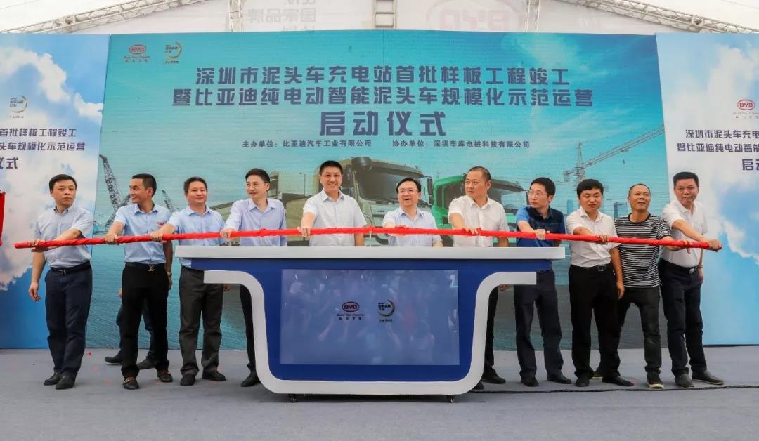 2018年7月12日,“深圳市泥头车充电站首批样板工程竣工暨比亚迪纯电动智能泥头车规模化示范运营启动仪式”在坂田街道车库电桩万科第五园充电场站举行。这是继5月8日首批500台订单签约、6月9日车辆批量生产下线之后,深圳市纯电动智能泥头车推广迈出的坚实一步。