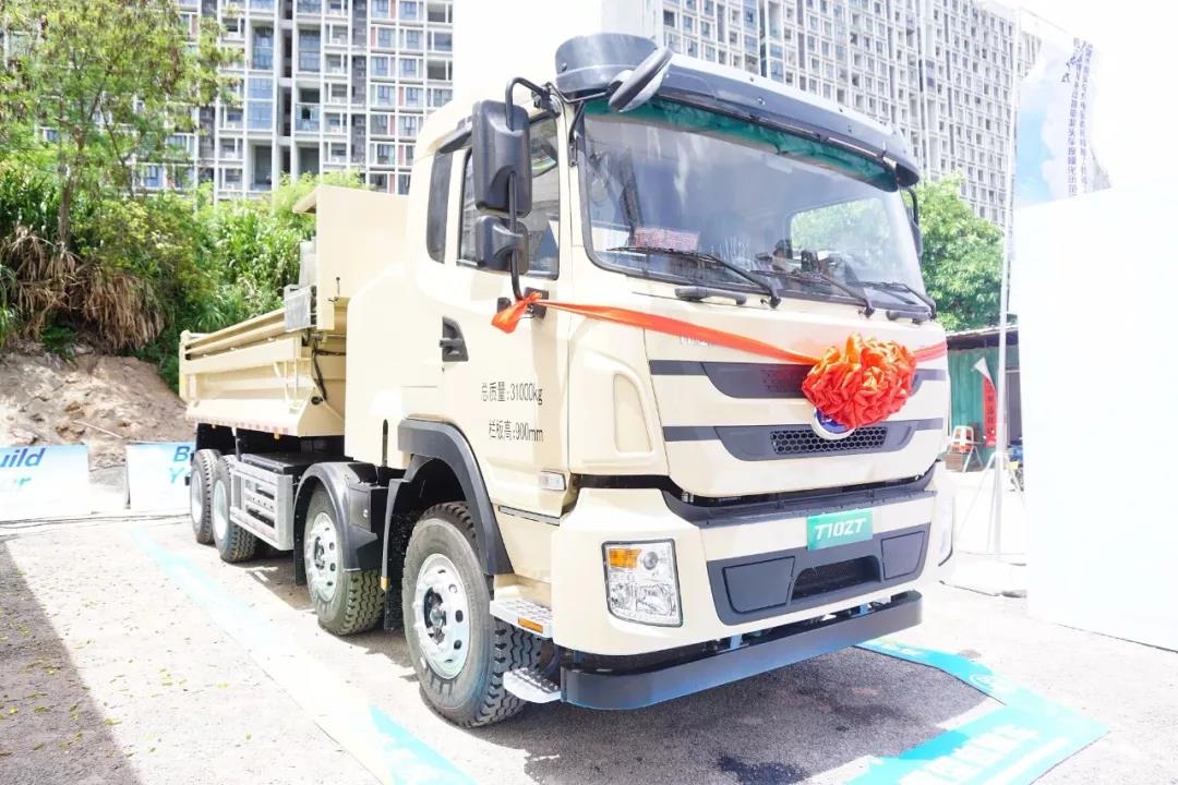 比亚迪T10ZT纯电动智能泥头车整车尺寸9610mm×2550mm×3210mm,满载续航里程280公里以上,最大爬坡度达50%。根据深圳技术法规要求,车辆上装采用新型U型货箱,提供平推式折叠顶盖和摇臂式整体前移顶盖两种密闭系统选择。T10ZT搭载比亚迪多项全球领先或行业首创核心技术,一是采用全球首创电动集成桥总成技术,配备180KW双电机+4AMT变速+16吨级车桥,实现不同动力输出,提高驱动效率与经济效益;二是采用行业首创六合一集成控制器,集驱动电机控制、高压配电、转向电机控制、制动空压机控制、双向DC逆变器功能于一体;三是采用高安全标准电池包,整车电量435kWh,并配备行业首创动力电池热管理系统自动,将电池电芯温度控制在最佳范围,确保车辆全生命周期运营品质。