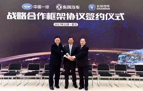 2017年12月1日,长安汽车、中国一汽与东风汽车共同签署了战略合作框架协议,根据战略合作协议,三方将在前瞻共性技术、汽车全价值链运营、拓展海外市场以及探索新商业模式四个领域展开合作。此次共享出行项目的成立,正是对战略合作框架协议的又一项落地。