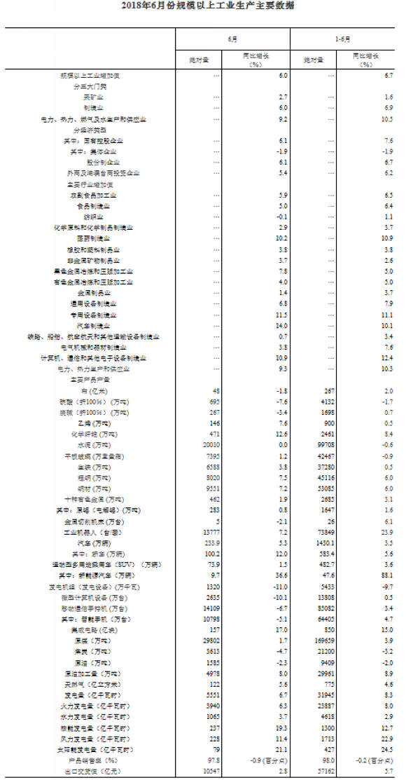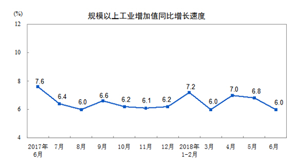国家统计局发布2018年6月份规模以上工业增加值增长6.0