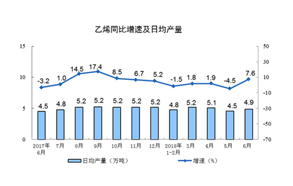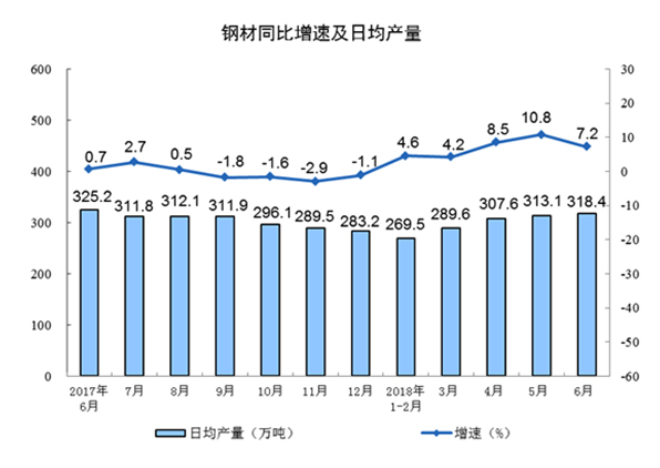 分产品看,6月份,596种产品中有303种产品同比增长。其中,钢材9551万吨,同比增长7.2%;水泥20010万吨,同比持平;十种有色金属462万吨,增长1.9%;乙烯146万吨,增长7.6%;汽车233.9万辆,增长5.3%;轿车100.2万辆,增长12.0%;发电量5551亿千瓦时,增长6.7%;原油加工量4978万吨,增长8.0%。
