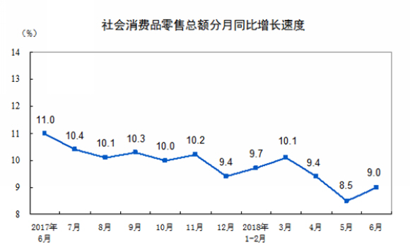 2018年6月份,社会消费品零售总额30842亿元,同比名义增长9.0%(扣除价格因素实际增长7.0%,以下除特殊说明外均为名义增长)。其中,限额以上单位消费品零售额12448亿元,增长6.5%。