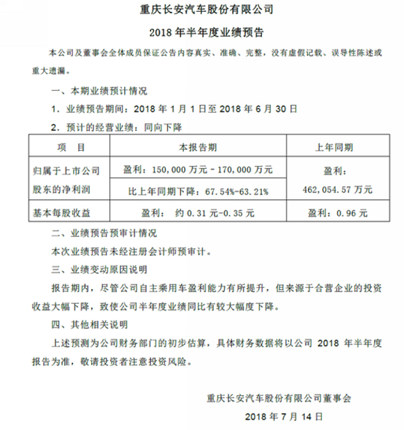 近日,长安汽车发布半年业绩预告:公司预计上半年实现归属于上市公司股东的净利润15亿元至17亿元,同比下降67.54%至63.21%,每股收益约0.31元至0.35元。2017年上半年公司盈利约46.21亿元,每股收益0.96元。