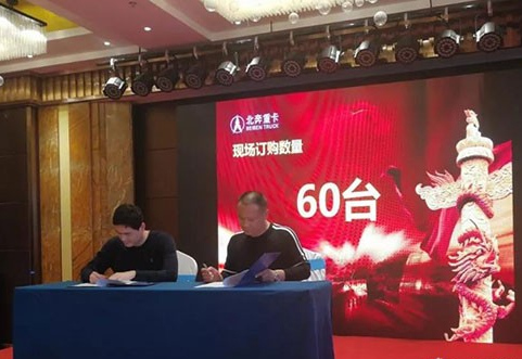 由王冉为用户介绍北奔重汽的企业文化、经营理念、产品优势等,并针对北奔城市智能渣土车从多、快、好、省四个方面做了进一步的详细讲解,还介绍了北奔自主研发的车联网系统可完成远程故障诊断、安全报警监管、油耗和位置监控、驾驶行为评估、线路管理等智能车辆管理系统,让客户对北奔重汽及渣土车有了更为全面的了解。