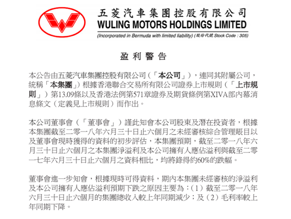 五菱汽车日前发布盈利警告,预期截至今年6月底止六个月净溢利及溢利,按年均将录得约60%的跌幅,主要原因为期内总收入按年减少及毛利率按年下降。