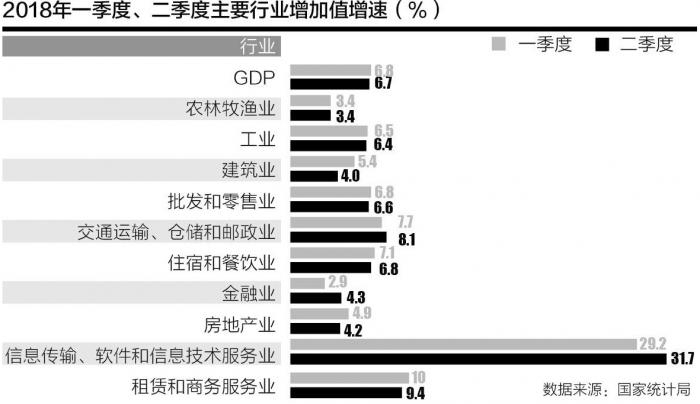 7月17日,国家统计局公布了2018年我国二季度国内生产总值(GDP)初步核算结果。数据显示,第二季度,我国GDP同比增长6.7%,金融业增加值同比增长4.3%,房地产业增加值同比增长4.2%,信息传输、软件和信息技术服务业增加值同比增长31.7%。