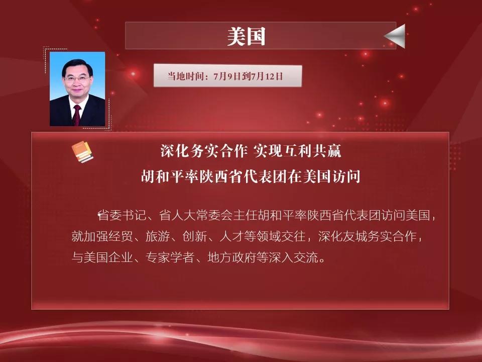 7月9日-18日,陕西省委书记、省人大常委会主任胡和平率陕西省代表团对美国、哥伦比亚、巴西进行友好访问。双方深化务实合作,实现互利共赢,胡和平率陕西省代表团在美国访问法士特与伊顿签署战略协议。