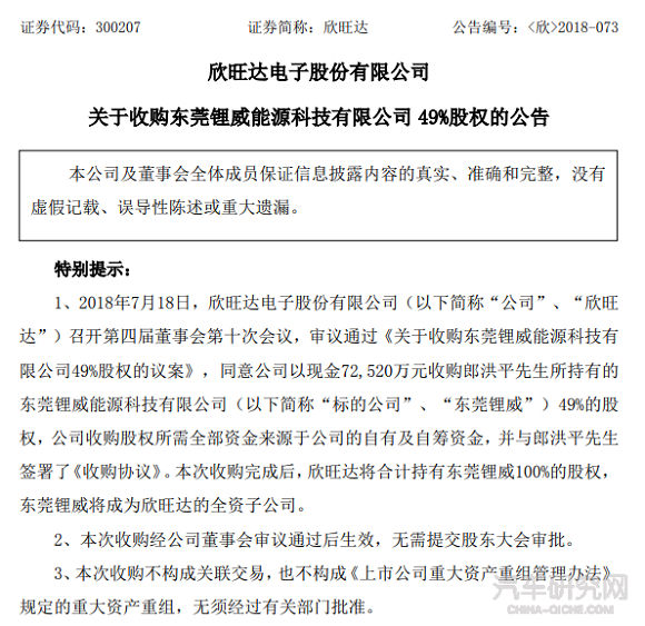 欣旺达7月18日晚发布公告,公司拟以现金7.25亿元收购郎洪平先生所持有的东莞锂威49%的股权,本次收购完成后,欣旺达将合计持有东莞锂威100%的股权,东莞锂威将成为欣旺达的全资子公司。东莞锂威成立于 2011 年,是欣旺达电子股份有限公司的控股子公司,是一家致力于锂离子电池电芯研发、制造和销售为一体的国家高新科技绿色能源企业,是国内领先的锂离子电芯解决方案及产品供应商。