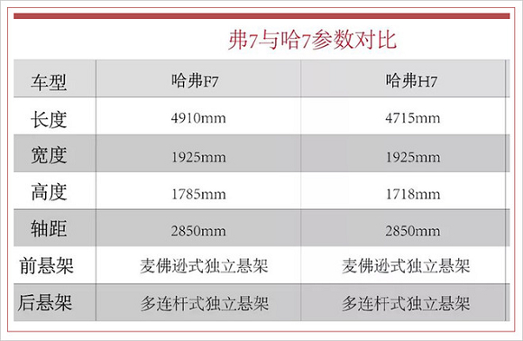 C柱与D柱间的车窗急剧收窄,呈现三角的形状。此外,根据这张疑似哈弗F7与H7的尺寸对比图来看,F7的长、宽、高分别为4,910毫米、1,925毫米、1,785毫米,轴距为2,850毫米。
