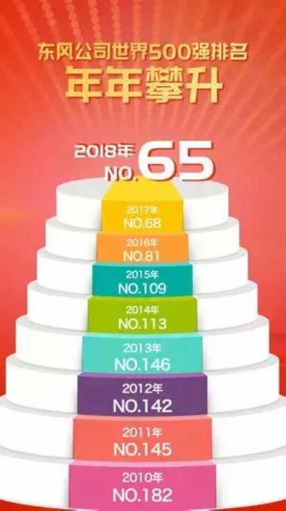 东风公司在世界500强的位置稳步提升,2018年排名65位。