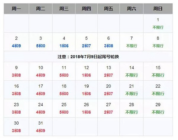 7月限行日历