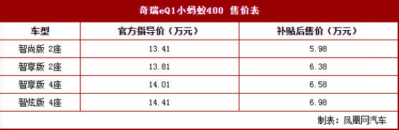 日前,我们从奇瑞新能源官方获悉,奇瑞eQ1小蚂蚁400车型正式上市。新车在续航能力方面有更出色表现,NEDC综合工况续航里程达301公里,60公里/时等速续航里程可达410公里。根据配置不同,新车共包含2座及4座版共计4款车型,其官方售价区间为13.41-14.41万元,全国统一补贴后售价为5.98-6.98万元。具体售价详见下表: