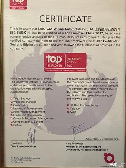 12月5日,上汽通用五菱被全球杰出雇主调研机构 Top Employers Institue