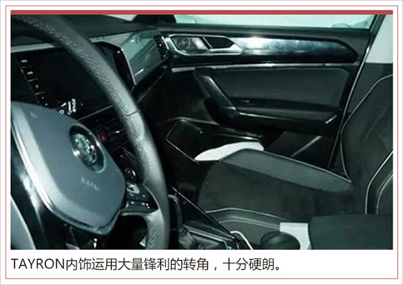 TAYRON也将于11月正式上市。近日,网通社获得一张TAYRON的内饰谍照。新车内饰在诸多细节处加入了棱角分明的设计,硬朗、具有设计感。TAYRON已于一汽-大众天津工厂正式下线,动力方面,采用2.0T高/低功率发动机。