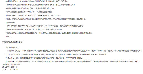(3)新能源汽车企业应按照《关于进一步做好新能源汽车推广应用安全监管工作的通知》的要求,建设和完善新能源汽车企业监测平台;客车产品应符合《电动客车安全技术条件》。申请《目录》时,企业应提交相关检测报告或产品安全监管承诺书(见附件5);
