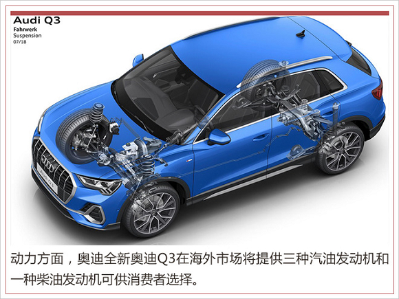 国产版本Q3的动力信息尚未曝出,而海外版车型则提供三种汽油机和一种柴油机供消费者选择,它们的最大功率从110千瓦到169千瓦不等。传动方面,匹配6速手动或7速双离合变速箱。此外,该车还可选装quattro四驱系统。