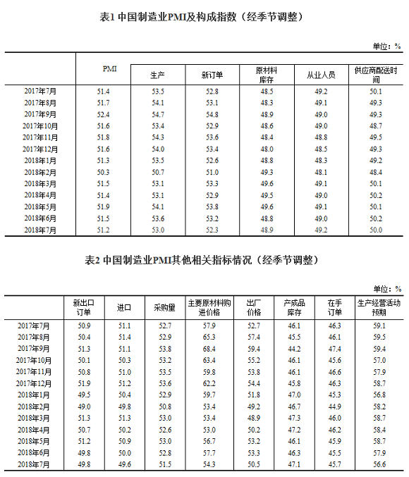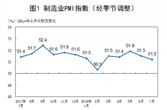2018年7月份,中国制造业采购经理指数(PMI)为51.2%,比上月回落0.3个百分点,高于临界点,制造业继续保持增长态势。