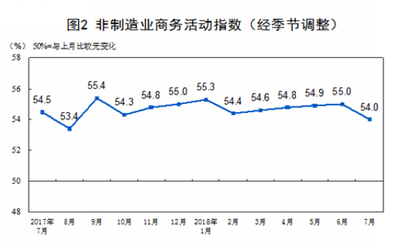 2018年7月份,中国非制造业商务活动指数为54.0%,比上月回落1.0个百分点,连续11个月保持在54.0%及以上的较高景气区间,表明非制造业继续保持较快增长。