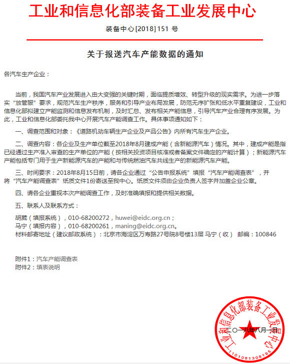 三、时间要求:2018年8月15日前,请各企业通过“公告申报系统”填报“汽车产能调查表”,并将“汽车产能调查表”纸质文件1份寄送至我中心。纸质文件须由企业负责人签字并加盖企业公章。