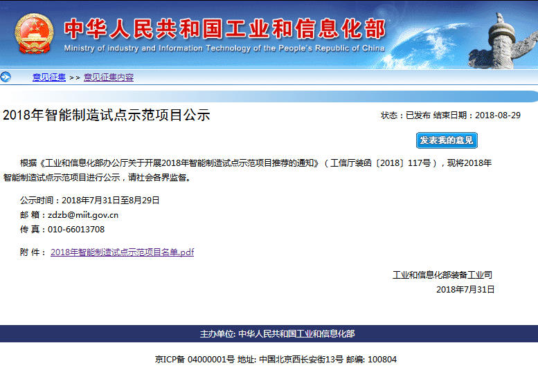 根据《工业和信息化部办公厅关于开展2018年智能制造试点示范项目推荐的通知》(工信厅装函〔2018〕117号),现将2018年智能制造试点示范项目进行公示,请社会各界监督。