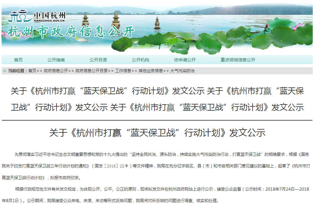 关于《杭州市打赢“蓝天保卫战”行动计划》发文公示
