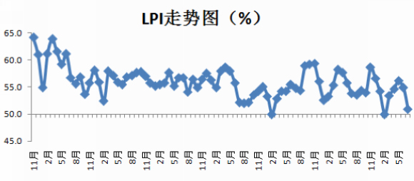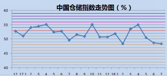 中国物流与采购联合会发布的2018年7月份中国物流业景气指数为50.9%较上月回落4个百分点;中国仓储指数为48.4%,较上月回落0.3个百分点;中国公路物流运价指数为97.4点,比上月回落1.16%。