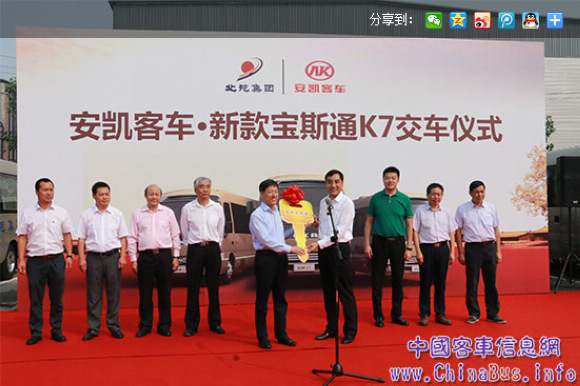 2016年9月23日,安凯宝斯通再次传来喜讯,35台汽油版宝斯通K7正式交付北京北汽出租汽车集团有限责任公司(以下简称北汽集团),将在未来与北汽集团携手共同保障各种政商重要场合的交通运输服务,提供更高效、更优质的服务保障。安凯客车董事长戴茂方出席交车仪式现场,并亲自将钥匙交付北汽集团董事长张峻峰。