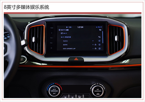 新车内饰整体以黑色调为主且加入橙色饰条与镀铬元素修饰,突显活力动感。中控台嵌入8英寸多媒体显示屏,并支持百度CarLife等多媒体系统,科技感十足;三辐式方向盘加入银色金属材质装饰,同时配备多功能按键,前方双圆盘仪表与行车电脑显示屏相结合,界面清晰易懂。