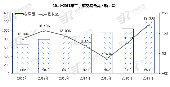 从以上五个部分经营主体对二手车行业的分析构成可以看出二手车市场整体进入了快车道。根据中国汽车流通协会数据统计显示,2017年全年共计完成1240.09万辆的交易规模,累计同比增长19.33%;交易额8092.72亿元,同比增长34%。