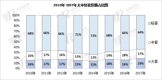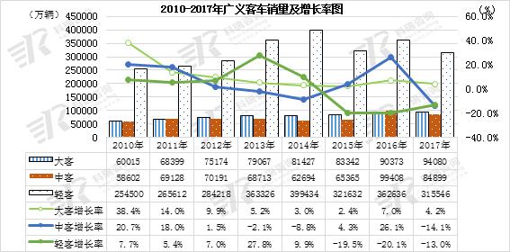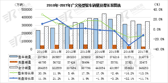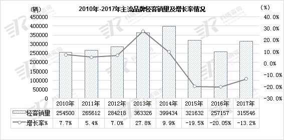 2010年至2017年,轻型客车市场销量前五年增幅高低不一,2015年至2016年市场增量全线下滑,其主因系“453文件”对日系中置发动机轻客产品的影响较大,进而导致市场销量有所下降。与此同时,大型微型客车和低端大MPV对短轴矩轻客形成的严重冲击也是显而易见的,依此市场销量快速下挫的惯性,预期
