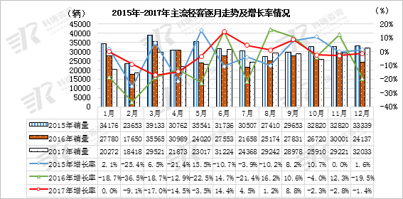 2017年轻型客车与同期对比之逐月销量,充分体现了其淡旺季之规律性,只是不如同期市场表现起落之反差与强烈,当总体上与前年同期相比落差较大,与去年同期相比也是错落起伏较大。