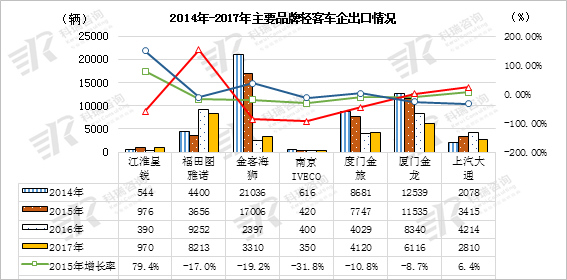 北汽福田、金杯客车、南汽依维柯、江淮汽车、东风汽车、大小金龙品牌系列以及上汽大通历年来一直系出口的主力军,2017年除江淮星锐、厦门金旅和南汽依维柯公司实现了出口正增长率外,其他轻客品牌的出口增长率皆为大幅负增长的暂时颓势。