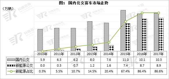 2017年,除中型客车市场增长率大幅下降外,大型客车以及轻型客车的市场增长率皆以微增长的态势呈现,这主要得利于新能源车的增量。大客以城市公交车和轻客以城市物流车的新能源车增量为主要推高因素所然。