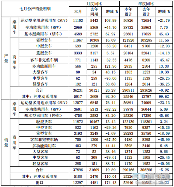 在乘用车方面,江淮汽车1-7月乘用车累计产量12.12万辆,同比下降3.99%,累计销量12.01万辆,同比下降5.76%;