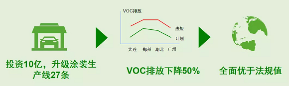 投资10亿巨资,在广州、郑州、襄阳、大连四地进行27条涂装生产线的升级工作,使挥发性有机物(VOC)排放下降50%,极大降低对环境带来的污染影响。