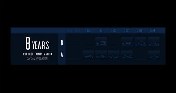 发布会上,GYON宣布未来8年将推出9款新车,计划未来10年内实现销量突破40万辆,致力成为新一代中国新高端电动汽车先锋,为中国市场提供全领域智能电动乘用车。