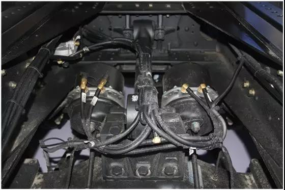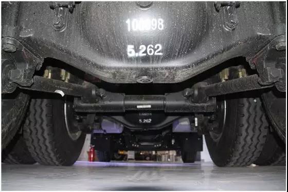 大运E8纯电动重卡采用非轮边电机的驱动形式,而是采用与传统车型一致的驱动方式,通过传动轴传递到驱动桥上,后桥为16吨级的轮减桥以满足更复杂的工况需求,I型推力杠显得更简单实用,管线路的布置也十分整洁。