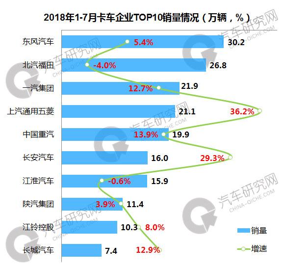 1-7月,卡车企业中,东风汽车位居第一,销量达到30.2万辆,同比增长5.4%;北汽福田位居第二,销量达到26.8万辆,同比下降4.0%;前十企业中,上汽通用五菱和长安汽车增幅相对较大,分别为36.2%和29.3%。