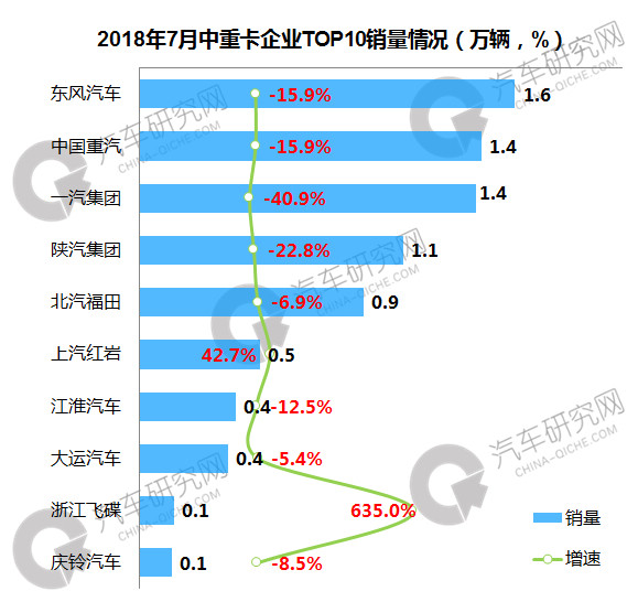 1-7月,中重卡前十企业中,一汽集团继续保持领先,累计销量达到18.3万辆,同比增长8.6%,东风汽车位居第二,累计销量达到15.4万辆,同比下滑0.9%;前十企业中,浙江飞碟增幅最大,同比增长812.6%。