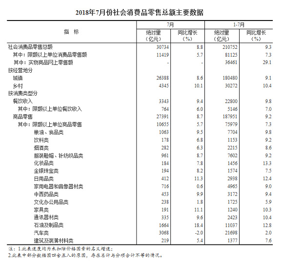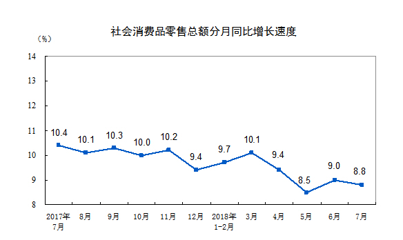 国家统计局:2018年7月份社会消费品零售总额增长8.8%