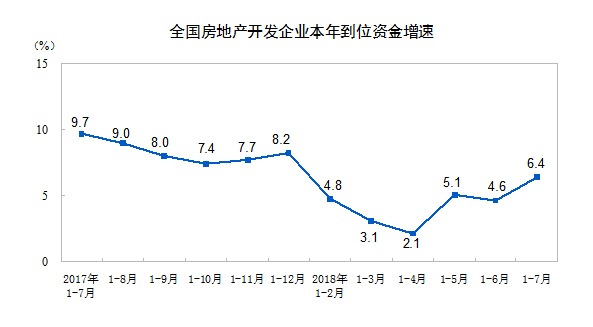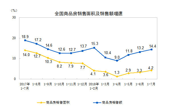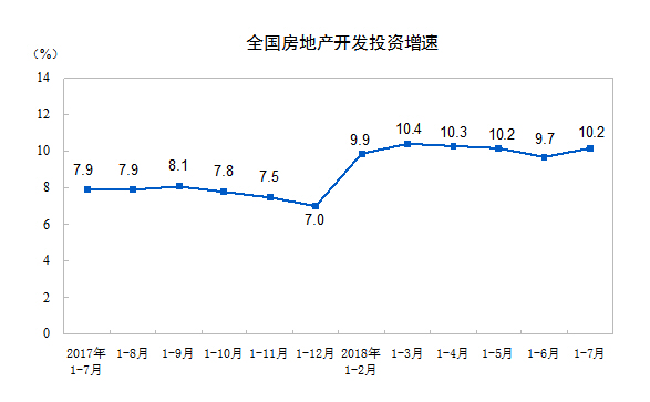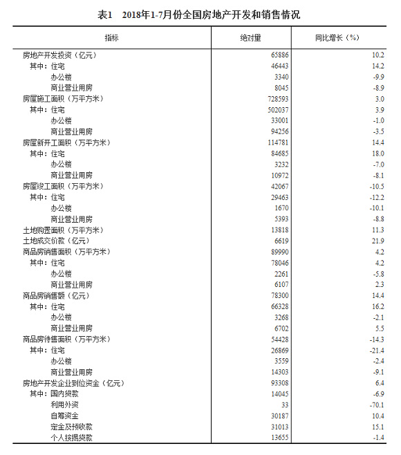 国家统计局:2018年1-7月份全国房地产开发投资和销售