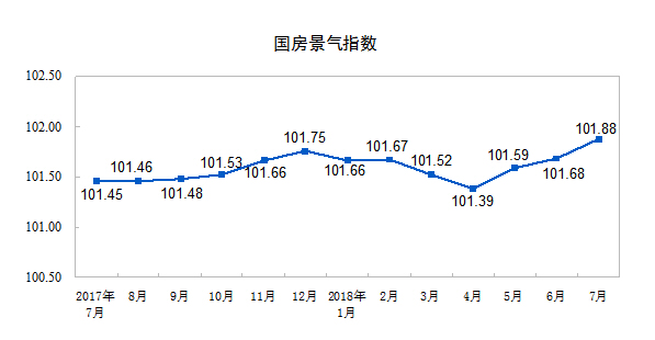 7月份,房地产开发景气指数(简称“国房景气指数”)为101.88,比6月份提高0.20点。