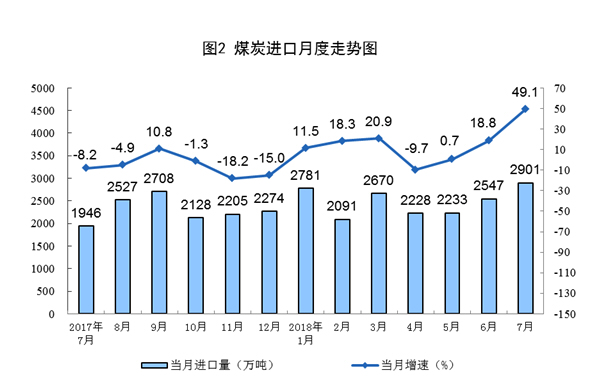 7月份,煤炭进口2901万吨,为2014年1月以来最高,同比增长49.1%,比上月增加354万吨。1-7月份,煤炭进口1.7亿吨,同比增长15.0%。
