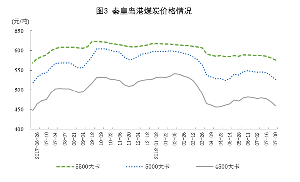 煤炭价格呈现平稳回落态势。截至7月30日,秦皇岛5500大卡煤炭综合交易价格为576元/吨,比6月底下降12元;5000大卡煤炭价格为527元/吨,比6月底下降20元;4500大卡煤炭价格为459元/吨,比6月底下降21元。