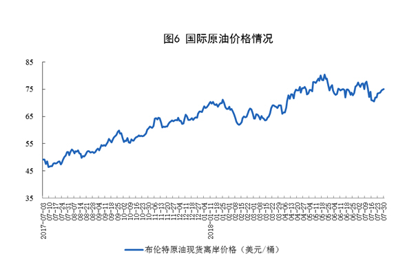 原油价格持稳盘整。截止7月底,布伦特原油现货离岸价格为74.99美元/桶,比6月底回落2.45美元/桶,但稳定在70美元/桶以上。