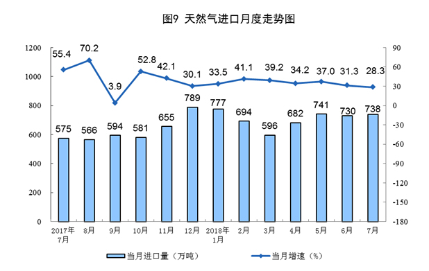 天然气进口持续高速增长。7月份,天然气进口量同比增长28.3%,增速比上月放缓3个百分点;进口天然气738万吨,比上月增加8万吨。1-7月份,进口天然气4943万吨,同比增长34.3%。