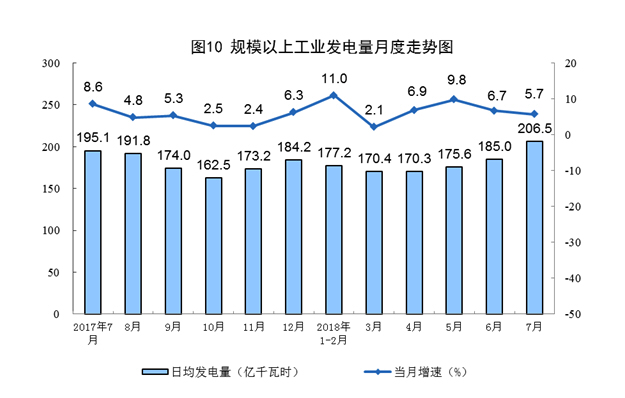 7月份,全国平均气温较常年同期偏高1℃,甘肃、湖北、吉林、辽宁、山东等地多发极端高温天气。受工业用电需求旺盛和持续高温影响,发电量迅速攀升,7月份发电6400.2亿千瓦时,同比增长5.7%;日均发电206.5亿千瓦时,比上月增加21.5亿千瓦时,创历史新高。1-7月份,发电量同比增长7.8%,比去年同期加快1.0个百分点。