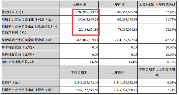8月14日,科大讯飞发布了2018年半年度报告。报告显示,2018年上半年科大讯飞实现营业收入320,998.93万元,相较于2017年同期的210,236.27万元,大增52.68%;实现净利润13,060.27万元,比上年同期增长21.74%。然尽管收入及净利同比双双上涨,今年上半年科大讯飞归属于上市公司股东的扣除非经常性损益的净利润却仅有2020万元,同比大幅下降74.39%。