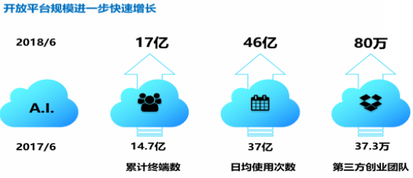 具体来看,2018年上半年科大讯飞基于拥有自主知识产权的世界领先的人工智能技术,持续推进“平台+赛道”的人工智能战略,成效显著。平台方面,截止本报告期末,科大讯飞凭借专为移动互联网、智能硬件的广大创业开发者和海量用户提供人工智能开发与服务能力的讯飞开放平台,已累计开放近百项