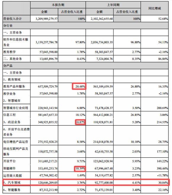 其中教育产品和服务、政法业务、智能硬件四个领域的业务,是科大讯飞盈利的重要支撑点,今年上半年占科大讯飞营业收入的比重分别达到了20.48%、10.87%和10.39%。特别是教育,财报显示今年上半年科大讯飞教育营收达6.58亿,同比增长16.35%。